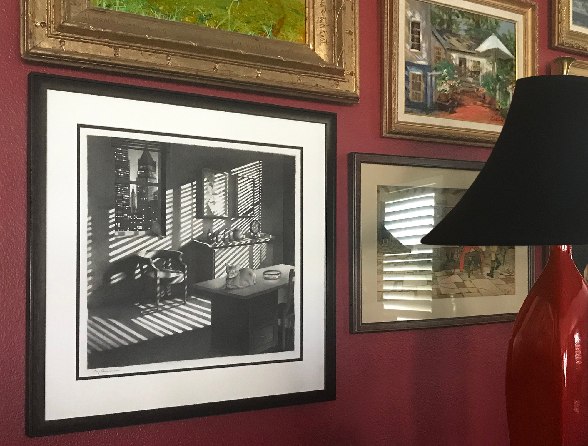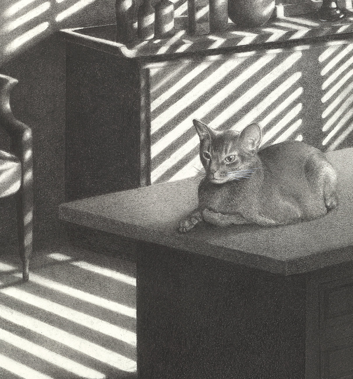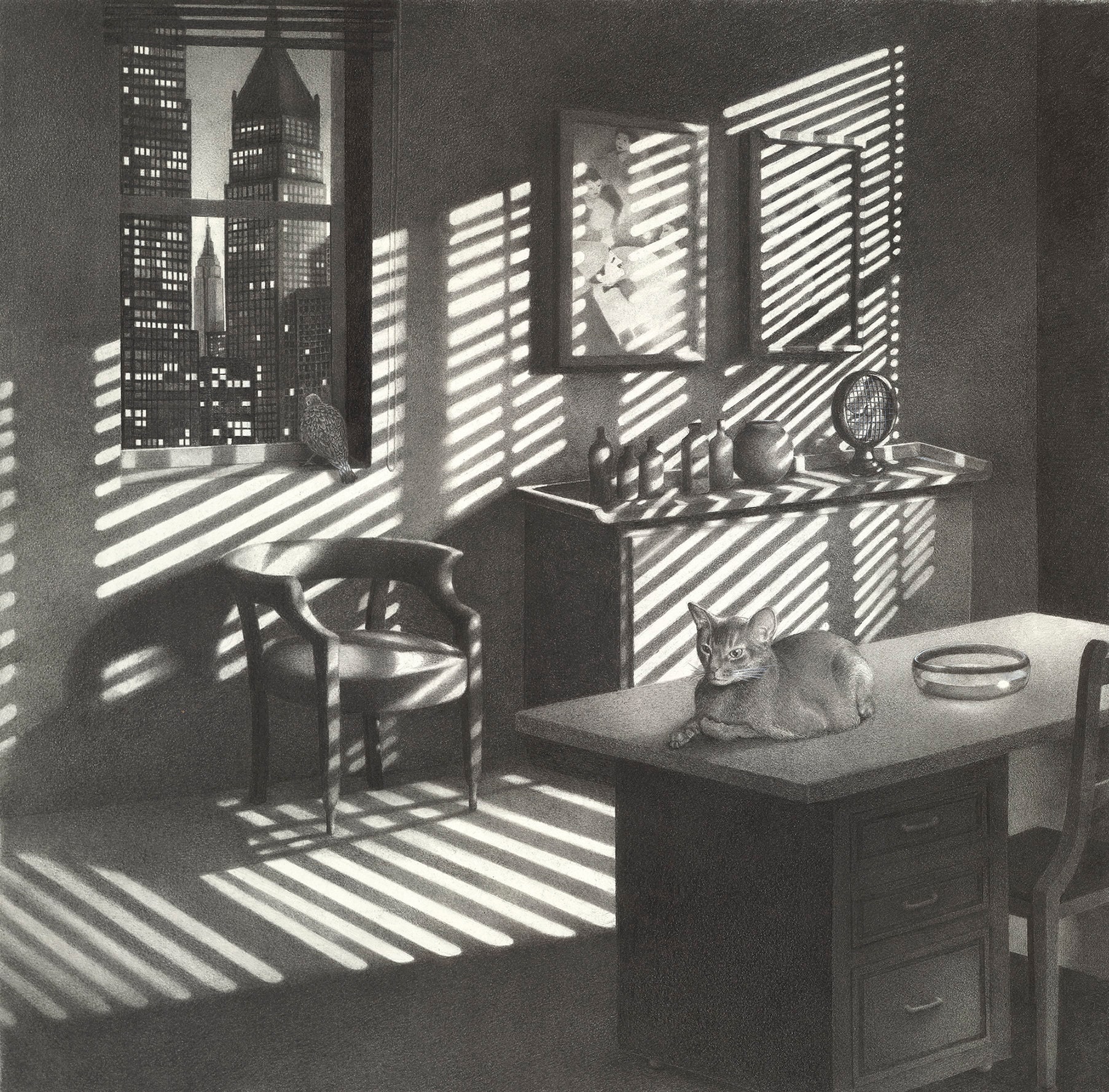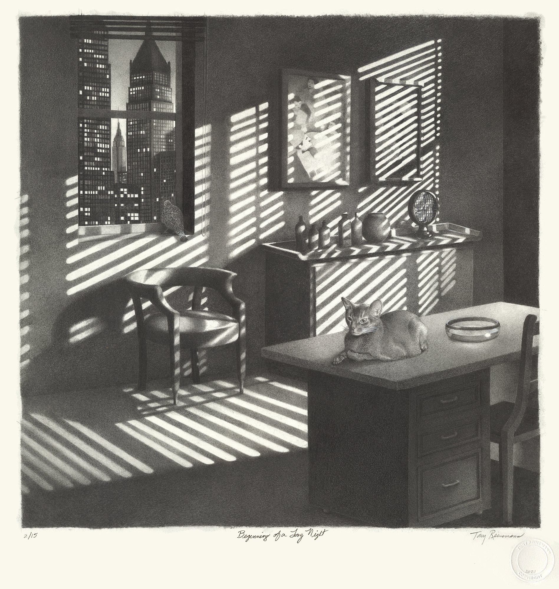 This pencil drawing is entitled BEGINNING OF A LONG NIGHT. The imagery was inspired by director Anotole Litvak and cinematographer Sol Polito’s film Sorry, Wrong Number. The film noir thriller starred Barbara Stanwyck and Burt Lancaster. This rendition stars Rex the Cat and takes place in midtown Manhattan.